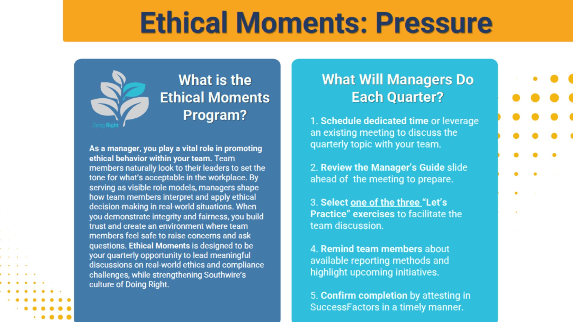 Southwire shares their Ethical Moments Manager Toolkits on Pressure, a resource to facilitate E&C conversations.