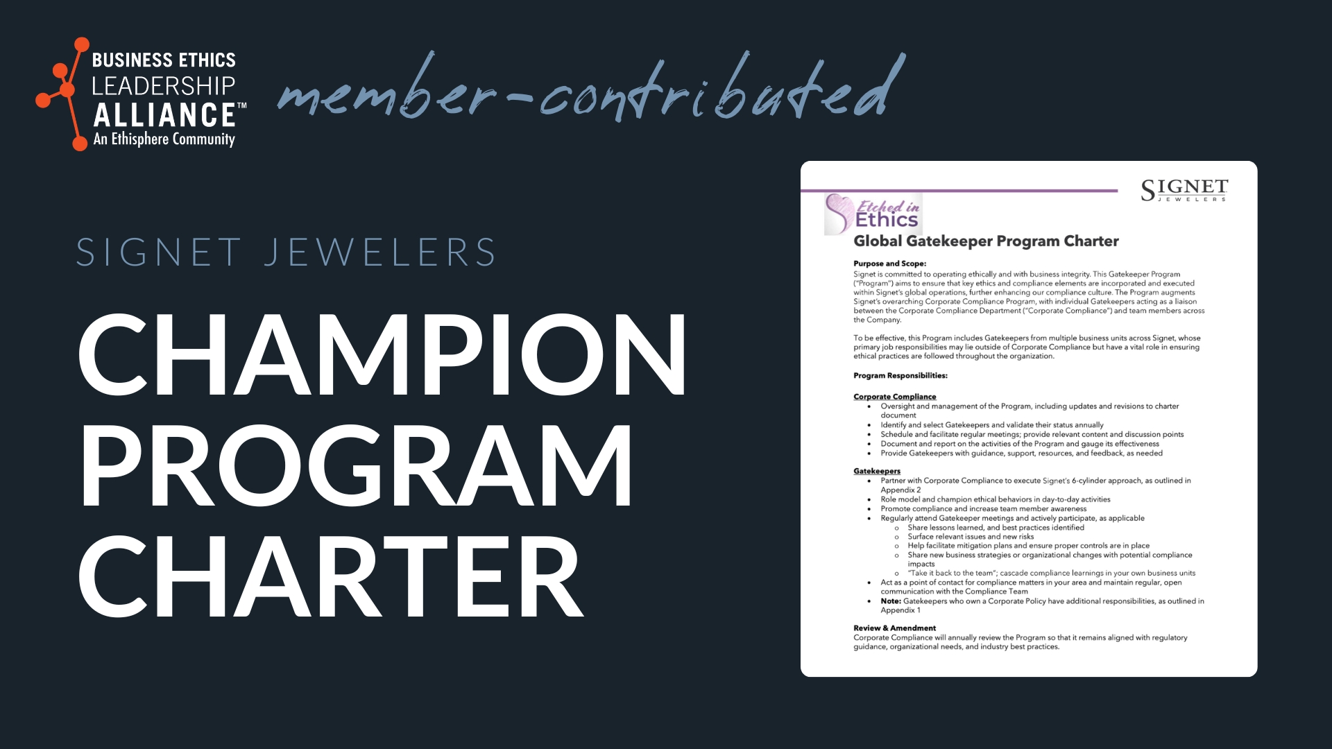 Signet Jewelers shares the charter for their champions program that explains the program, roles, and responsibilities.